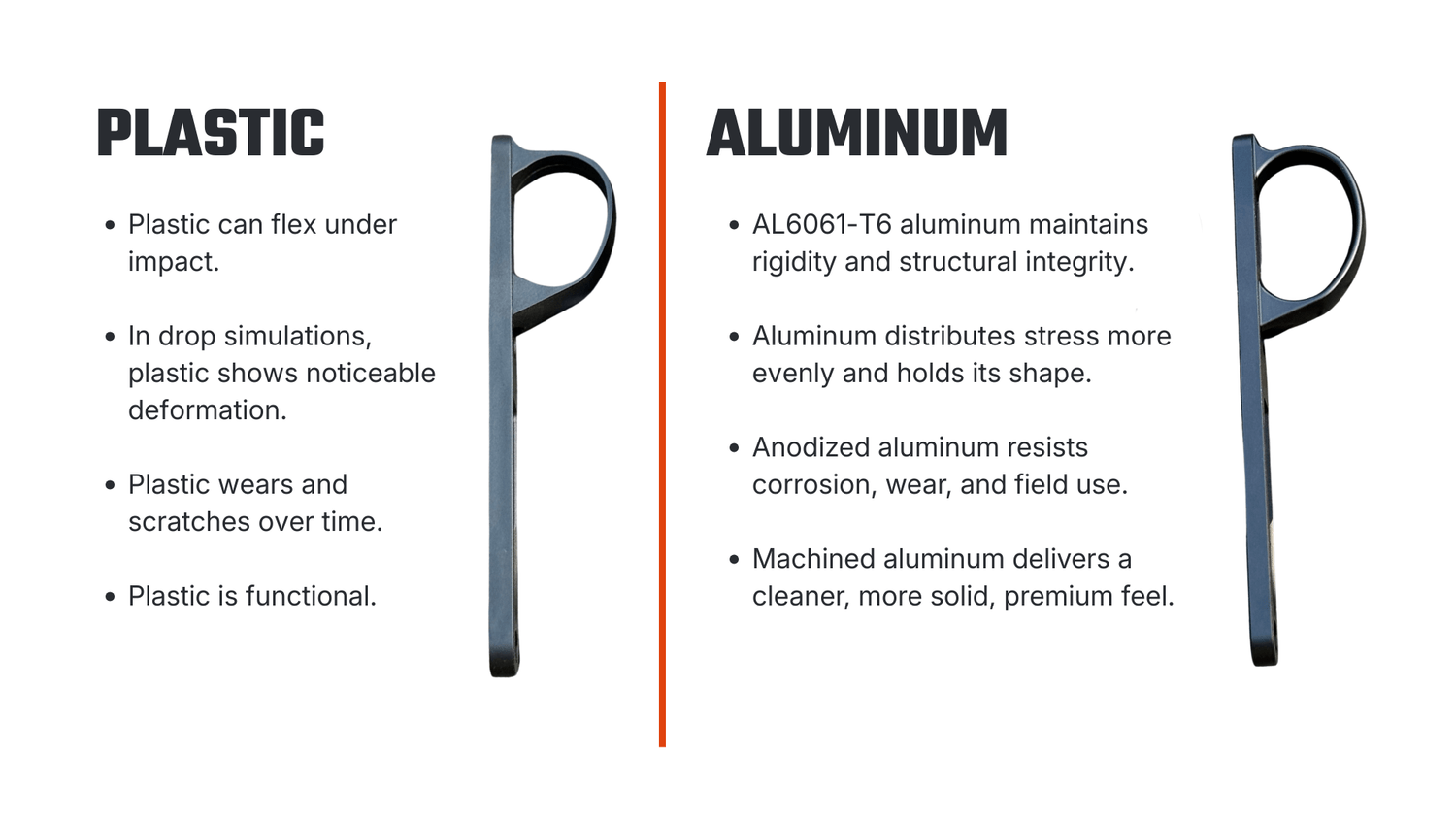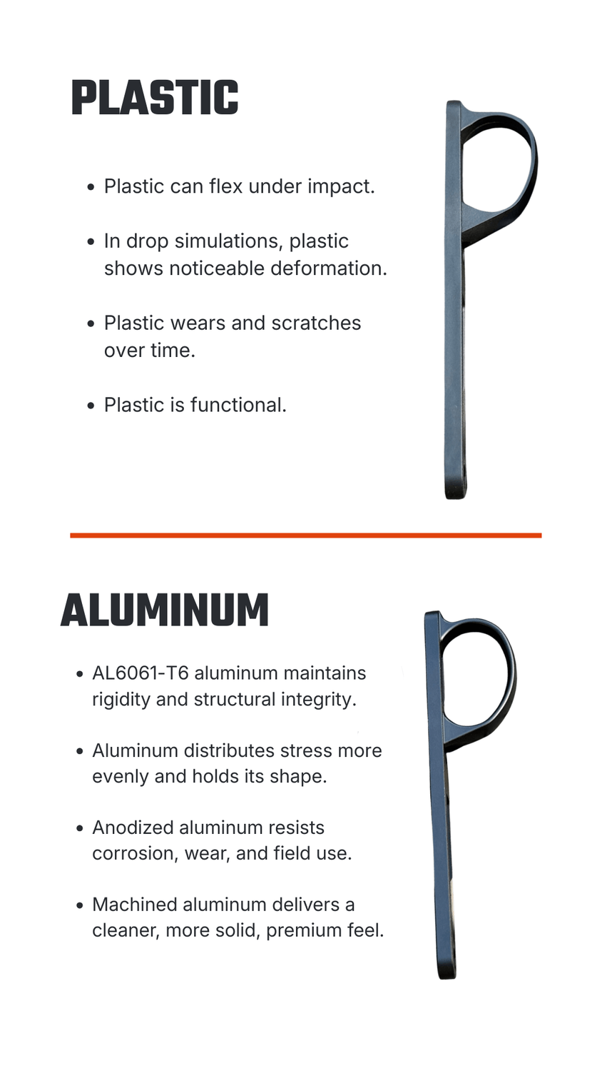 We simulated a 1-meter drop to compare the factory plastic trigger guard with our AL6061-T6 aluminum version.